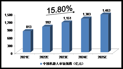 我们预计,2021年我国机器人市场规模将达到813亿元,未来五年(2021-2025)年均复合增长率约为15.80%,2025年将达到1,463亿元。